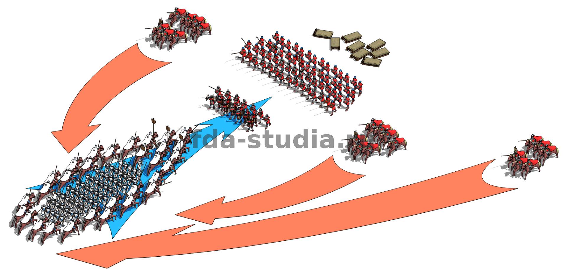 3D визуализация и 3D модель. Битва на льду Чудского озера между Новгородцами и Владимирцами под предвадительством Александра Невского, с одной стороны, и войсками Ливонского ордена, с другой стороны.